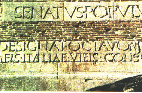 SENATUS. POPULUSQUE. ROMANUS./ IMP. CAESARI. DIVI. IULI. F. AUGUSTO. IMP. SEPT. / COS. SEPT. DESIGNAT. OCTAVOM. VIA. FLAMINIA. ET. RELIQUEIS. / CELIBERRIMEIS. ITALIAE. VIEIS. CONSILIO. ET. AUCTORITATE. EIUS. MUNITEIS.
